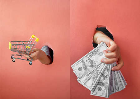 the buy buyers towels for the house and gives dollars to the seller. shopping concept