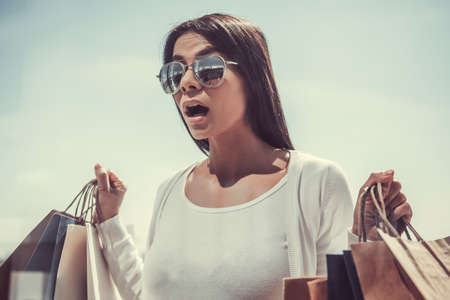 Young woman shopping on the street with many colorful bags, looking inside. sales, shopping and sales concept. Summer and lifestyle.
