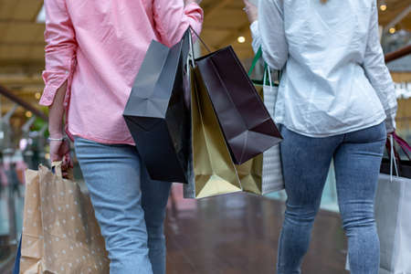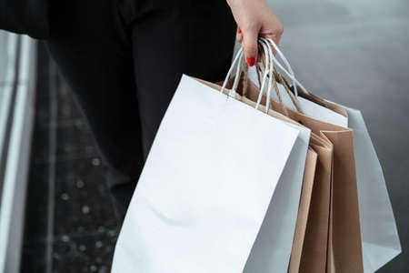 Woman holding shopping bags while doing shopping in the city. Closeup of woman holding brown and white shopping bags in the shopping mall.