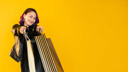 Go shopping. Happy stylish woman. Hot sale. Black friday. Advertising background. Pleased lady purple curly hair leather jacket showing purchase bags isolated yellow copy space.