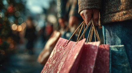 Close-up of woman holding hands while walking with shopping bags in an urban environment, evoking connection and consumer lifestyle.