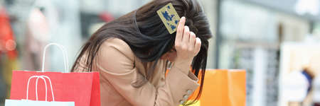 electronic payment and easy shopping with credit cards. woman backview with holding multiple bags in hands.