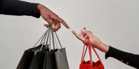 Close up shot of female and male hands holding black and red paper bags, reaching for each other isolated over gray background