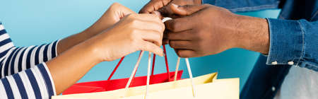 partial view of african american woman taking shopping bags from husband on blue, banner