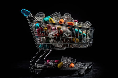 Metal trolley shopping cart, filled with radio components, stands on an electronic Board. Photo in dark backlit.