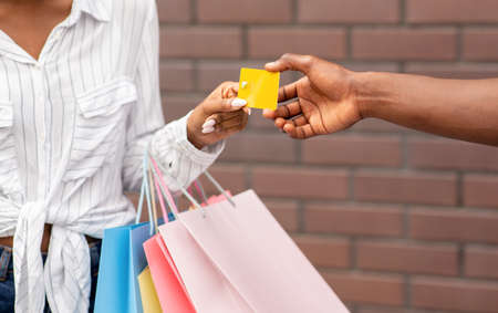Best price for branded stuff. African american girl shopper with colored bags gives credit card to seller