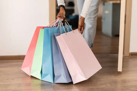 Unrecognizable Black Lady Carrying Many Shopping Bags Entering Home, Cropped