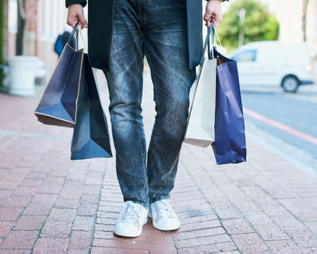 Man on a spending mission. Cropped shot of an unrecognizable man carrying shopping bags downtown.