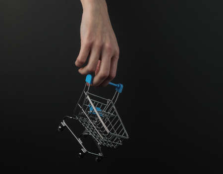 woman with small shopping cart. Handsome man collision with shopping trolley. Sale, discount and online shopping concept. Girl with mini shopping cart. Copy space