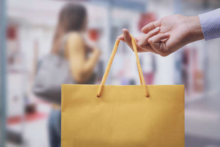 shop delivery. consumerism and online retail concept. man hand passing bags with purchases to a female customer.