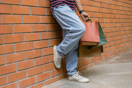 shopping concept A person in light blue jeans and white shoes leaning on the wall of the building while holding a lot of paper shopping bags.