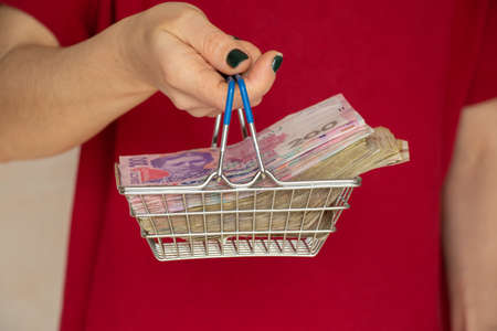 A woman's hand holds Ukrainian hryvnia in a basket from a supermarket, money in a basket, hryvnia, food prices