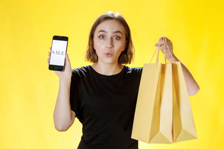 Caucasian young woman smiling and holding mobile phone, and shopping package and looking into phone screen.