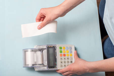 Close-up of a young woman's hands tearing a check from a cash register after purchasing a product, entering a discount on a market or store. Business idea, trade