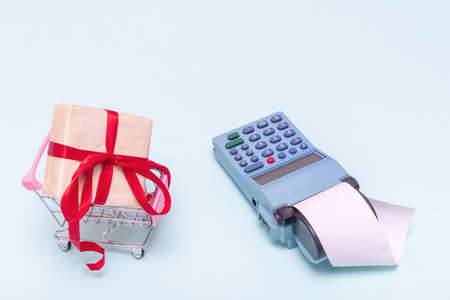 Buying gifts for the holiday concept. Online shopping concept. Gift in a shopping trolley and cash register with a blank white check on a light blue background. Business concept