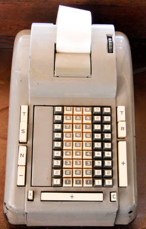 A high angle shot of a small vintage cashier machine on a wooden surface