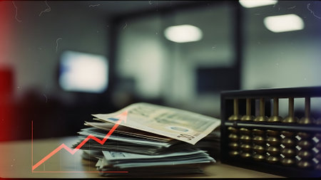 A close-up still life of antique financial and accounting instruments on a dark wooden table. The composition includes a classic wooden abacus, an old mechanical calculating machine, rolled-up paper documents or currency tied with twine, and a leather-bound notebook with a fountain pen. The moody lighting enhances the historical and nostalgic atmosphere, representing the evolution of financial management and traditional business practices.