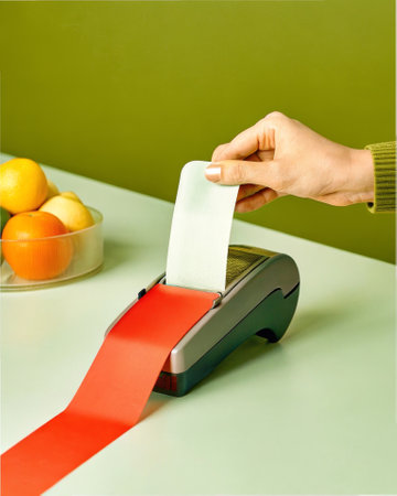 Hand using receipt printer with red paper roll on green background with fruit bowl.