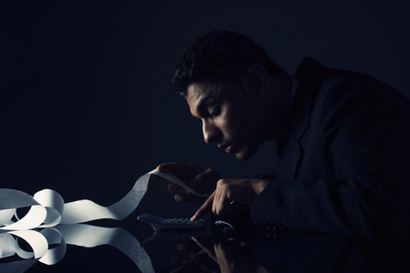 Woman using a manual adding machine to do the accounts and balance the books in the office or home, closeup low angle view with focus to the figures on the paper strip in a financial concept.