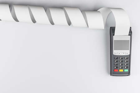 Wireless credit card payment terminal with cash register tape on light background with copyspace, POS payment concept. 3D rendering, mock up