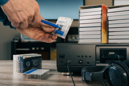 Male music lover holding audio cassette and doing manual rewinding of magnetic tape. Nostalgic music setup featuring a cassette recorder and high-quality audio equipment in a dedicated listening room