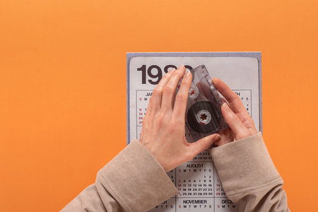 Nostalgic sentimental woman with old calendar and compact tape reliving music of 80s memories. hands with an audio cassette and 1980 calendar, symbolizing a nostalgic trip back to the retro era