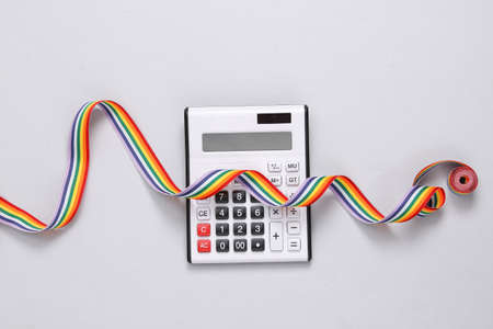 Calculator with lgbt rainbow ribbon on gray background. top view
