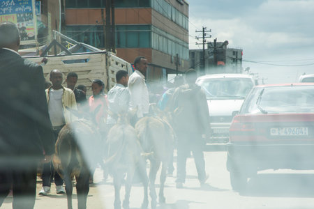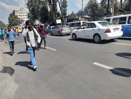 Addis Ababa, Ethiopia - January 18, 2010: People cross street in downtown Addis Ababa, Ethiopia.