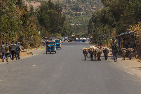WOLLEKA, ETHIOPIA - MARCH 14, 2019: Road trafic in Wolleka village, Ethiopia.