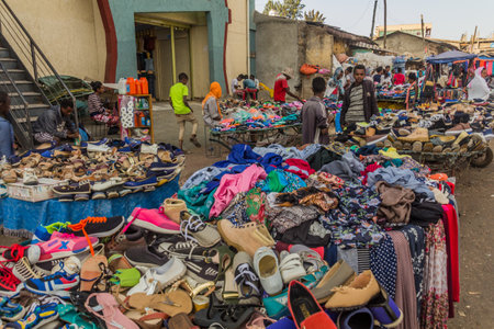 GONDAR, ETHIOPIA - MARCH 13, 2019: Shoe stalls at a market in Gondar, Ethiopia.