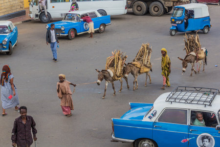 HARAR, ETHIOPIA - APRIL 8, 2019: Donkeys transport a firewood across Feres Magala square in Harar, Ethiopia