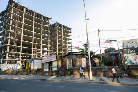 Addis Ababa, Ethiopia, January 30, 2014, Pedestrians walking down a street with a construction site in the background in the heart of a developing city