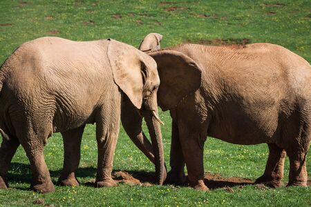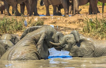 Two elephants fighting in the mud, Addo Elefant Park, South Africa.
