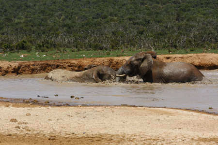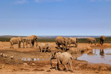 herd of elephants all along a mud lake in Addo national park, South Africa