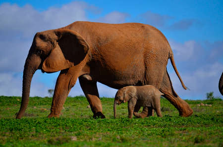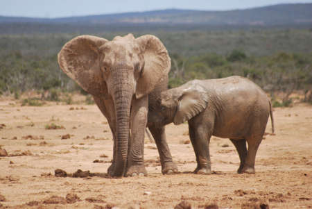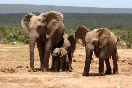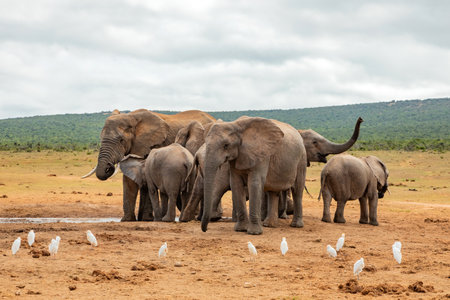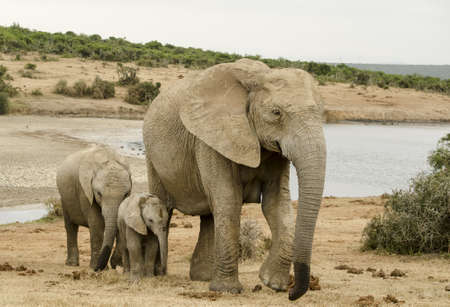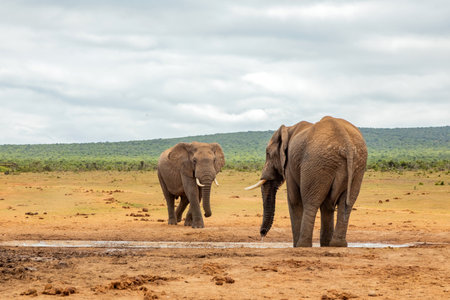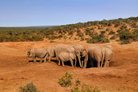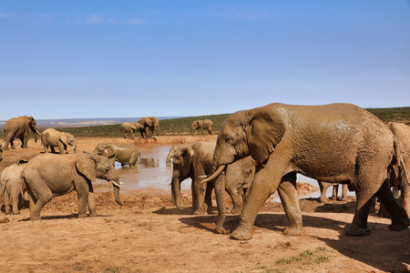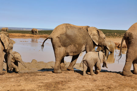 Family elephants walking in Addo Elephant National Park near the pool in summer season. Addo NP is located in Eastern Cape, near Port Elizabeth, South Africa is a famous destination for African safari