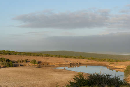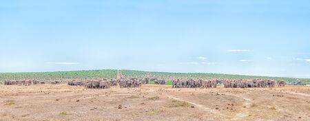 African elephant herd (Loxodonta africana) at a waterhole, Addo Elephant National Park, South Africa