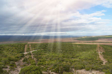 African vast landscape of bushveld and grassland with sun shining through clouds