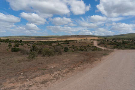 Vast African savannah landscape with unsealed road on sunny day. Nature background