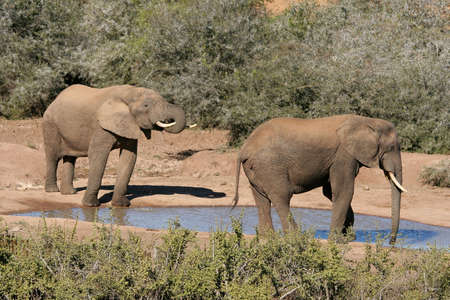 Wild elephants drinking water from waterhole in African wilderness. African safari game drive adventure scene