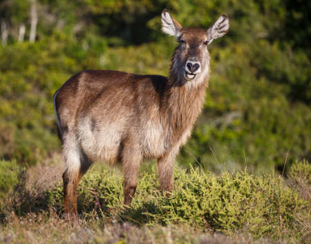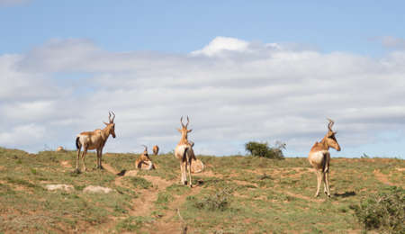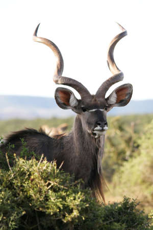 Group of female kudu antelopes at waterhole in African savannah. Safari game drive in South Africa