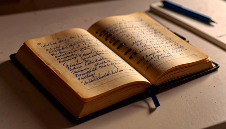 An open notebook with a pen rests on a wooden table, suggesting a setting for writing or planning. The image showcases warm, natural tones and textures. The composition, lit by overhead lighting, presents a top-down view. This image is suitable for various commercial uses, including articles and marketing materials.