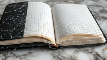 Academic Blank Notebook - Classic composition notebook opened to show clean graph paper pages, black marble cover partially visible.