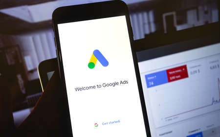 Google Ads app on the screen smartphone with notebook background closeup. Ads is a service of contextual, basically, search advertising from Google. Moscow, Russia - October 21, 2019