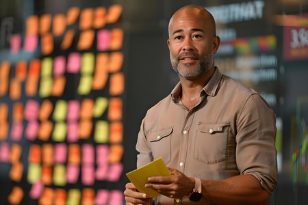 A man thoughtfully places sticky notes on a planning board in a creative office environment.