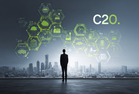 A silhouette of a man stands before a cityscape with data visualization elements, rendered in shades of grey and green. The composition features a low-angle shot, highlighting a modern architectural setting. It shows a concept of technology and infrastructure, which is suitable for business or editorial use.
