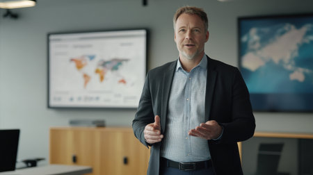 A man stands in a contemporary office delivering a presentation about global market trends. A large screen displays a colorful map highlighting various regions