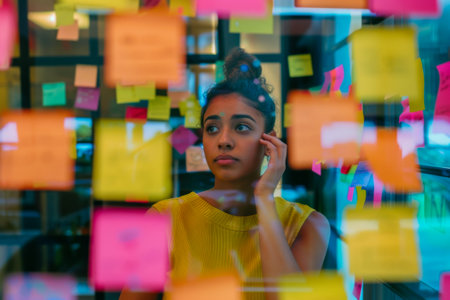 A woman in a yellow shirt is looking at a wall covered in colorful sticky notes. She is deep in thought, possibly contemplating her next move or trying to solve a problem