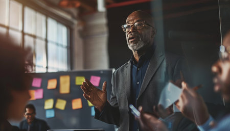 Entrepreneur leads vibrant workshop, encouraging communication and strategy between team., generative AI
