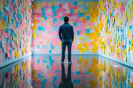 A man in a modern room surrounded by colorful sticky notes creating a vivid mosaic of ideas