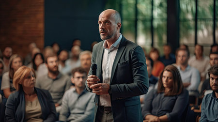 A male speaker giving presentation in hall at university workshop. Audience or conference hall. Training. Generative Ai